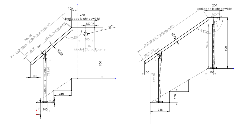 Im Folgenden sehe Sie die technische Zeichnung für die beiden oberen Handläufe vom Foto. Ich arbeite hier mit diversen Fachbetrieben zusammen, welche den Handlauf nach Ihren Wünschen erstellen.
